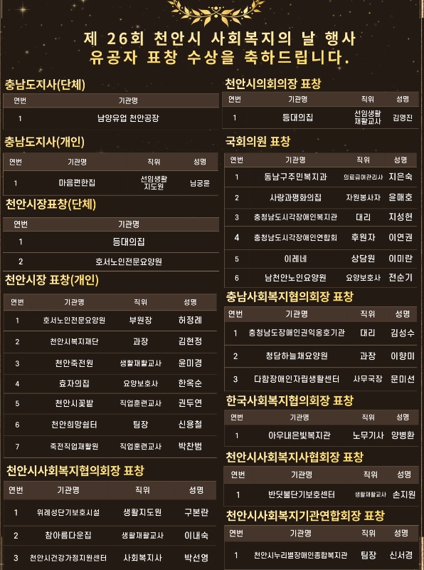 제 26회 천안시사회복지의 날 행사 유공자 표창수상 페이지 정보 작성자작성자 : 천사협 조회조회수 : 1,399회 작성일작성일 : 25-09-23 13:14 본문 수상을 축하 드립니다! 목록 이전글2025년 법인 정기 이사회의(2차) 개최 25.03.11 다음글「제26회 천안시사회복지의 날 행사」사회복지 유공자 추천 협조 요청 25.07.28